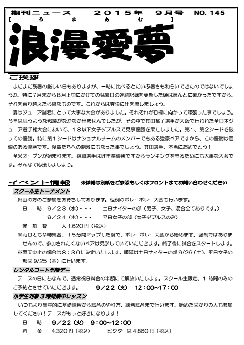 こういった機会に、ジュニアのみなさんは、日頃テニスが心置きなくできるのも、お父さんお母さんのおかげであることを再認識し、感謝の気持ちを持って、テニスに打ち込みましょう。