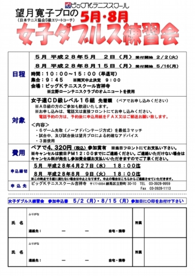 先日、雪で中止となった望月プロの女子ダブルス練習会を改めて募集いたします。