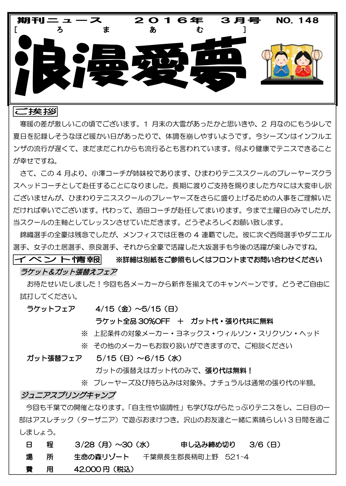 プレーヤーズの皆さんも、畠中校長を始め、各コーチのアドバイスを良く聞いて、しっかりテニスに打ち込み、目標を高く持って、上を目指して頑張ってください。